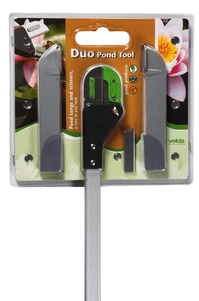 Om de vijver in een goede conditie te houden, is regelmatig onderhoud nodig. Afgestorven plantdelen, ingewaaide takjes en dergelijke dienen tijdig uit de vijver te worden verwijderd. Speciaal voor dit doel heeft Velda een twee-in-één gereedschap ontworpen: de Duo Pond Tool. Met dit gereedschap kan worden gesnoeid en door het opzetten van de bijgeleverde grijpelementen kunnen de plantdelen uit de vijver worden gehaald.