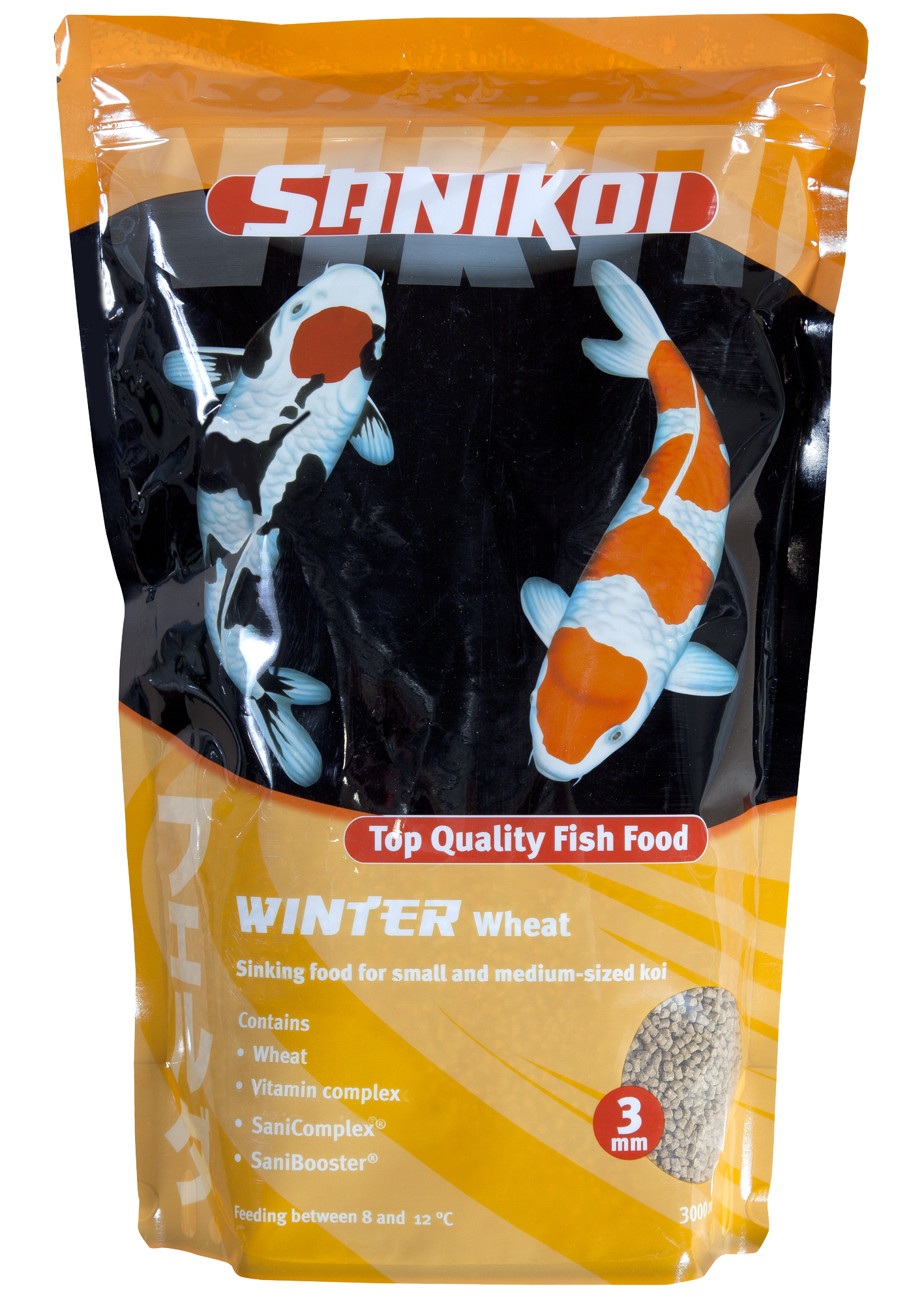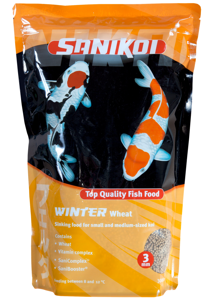 SaniKoi Winter Wheat is een top quality food voor Japanse koi en andere waardevolle karperachtigen. Het is een zinkend voeder dat de natuurlijke ziekteweerstand van de vissen kan stimuleren. De hoofdbestanddelen bestaan uit visproducten, plantaardige eiwitten, vetten, koolhydraten en aangevuld met tarwe. Speciale aandacht is gegeven aan de toegevoegde sporenelementen en vitaminecomplex, waaronder het gestabiliseerde vitamine C. Vissen zijn koudbloedige dieren. Dat betekent, dat de lichaamstemperatuur zich aanpast aan het omringende water. Onder de 12 °C neemt de activiteit aanmerkelijk af en daarmee de energiebehoefte. Ook de voedselopname vertraagt. Om echter de lange winter gezond en in goede conditie te kunnen overleven, is bijvoederen van de vissen ook in deze periode gewenst. SaniKoi Winter Wheat is een vijvervoeder met een verlaagde energiewaarde.